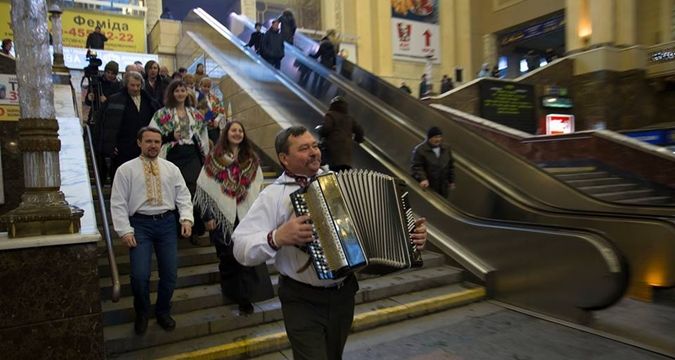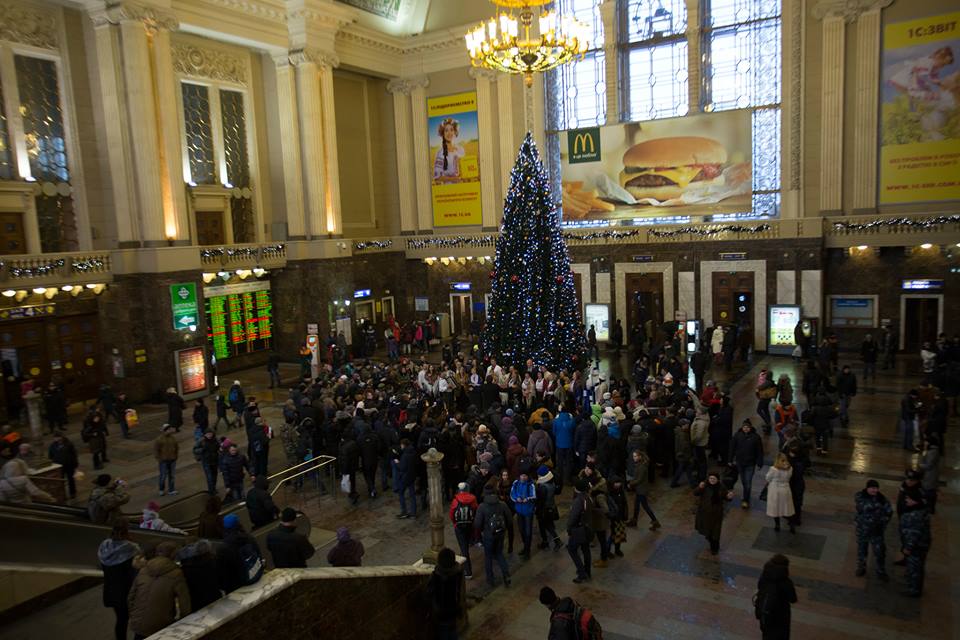 Артисти Заслуженої хорової капели, клубу залізничників станції Ніжин і самодіяльного колективу «Цвіт калини» заспівали для киян під новорічною ялинкою на Київському залізничному вокзалі.