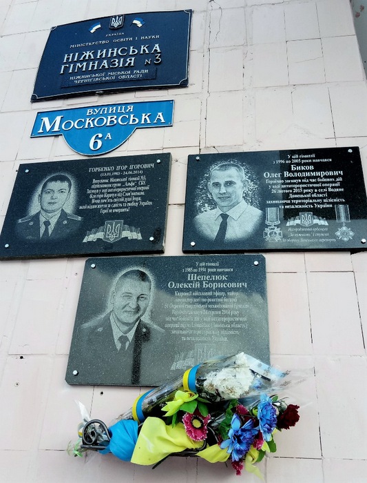 26 лютого 2015 року біля Водяного на Донбасі під час нерівного бою обірвалося молоде життя Олега Бикова, національного героя, старшого розвідника розвідувального взводу 90 аеромобільного батальйону 95 аеромобільної бригади десантних військ Збройних Сил України, прекрасного люблячого і любимого сина, надійного товариша, відважного побратима, доброго учня і випускника Ніжинської гімназії №3.