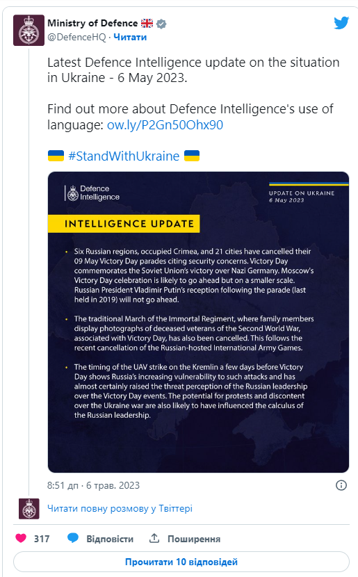 "Шість регіонів Росії, окупований Крим та 21 місто скасували паради на честь Дня перемоги 9 травня, посилаючись на міркування безпеки. Святкування Дня перемоги у Москві, швидше за все, відбудеться, але у меншому масштабі. Прийом президента Росії Володимира Путіна після параду (останнього разу відбувся 2019 року) не відбудеться", — йдеться у повідомленні.